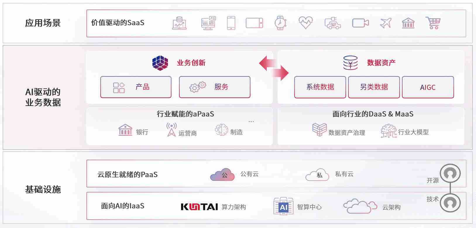 数字时代,,围绕企业数字化转型的关键要素,,,z6尊龙旗舰厅数码开创性的提出数云融合战略和技术体系框架,,,,着力在云原生、、、数字原生、、、、AI原生和信创产业上架构产品和服务能力,,为处在不同数字化转型阶段的快消零售、、汽车、、金融、、、、医疗、、、、政企、、、教育、、运营商等行业客户提供泛在的敏捷IT能力和融合的数据驱动能力,,,构建跨界融合创新的数字业务场景和新业务模式,,助力企业级客户建立面向未来的核心能力和竞争优势,,,全面推动社会的数字化、、、、智能化转型升级。。。。
